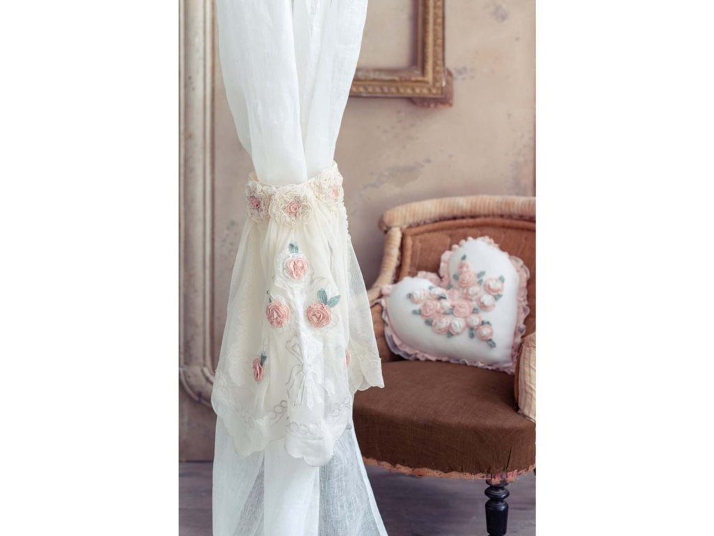 Exkluzívny vyšívaný úchyt na záves s aplikáciou ruží. Originálny výrobok z dielne Blanc Mariclo. Pranie v pračke na 30C. Cena za 1 kus. 100% ľan.