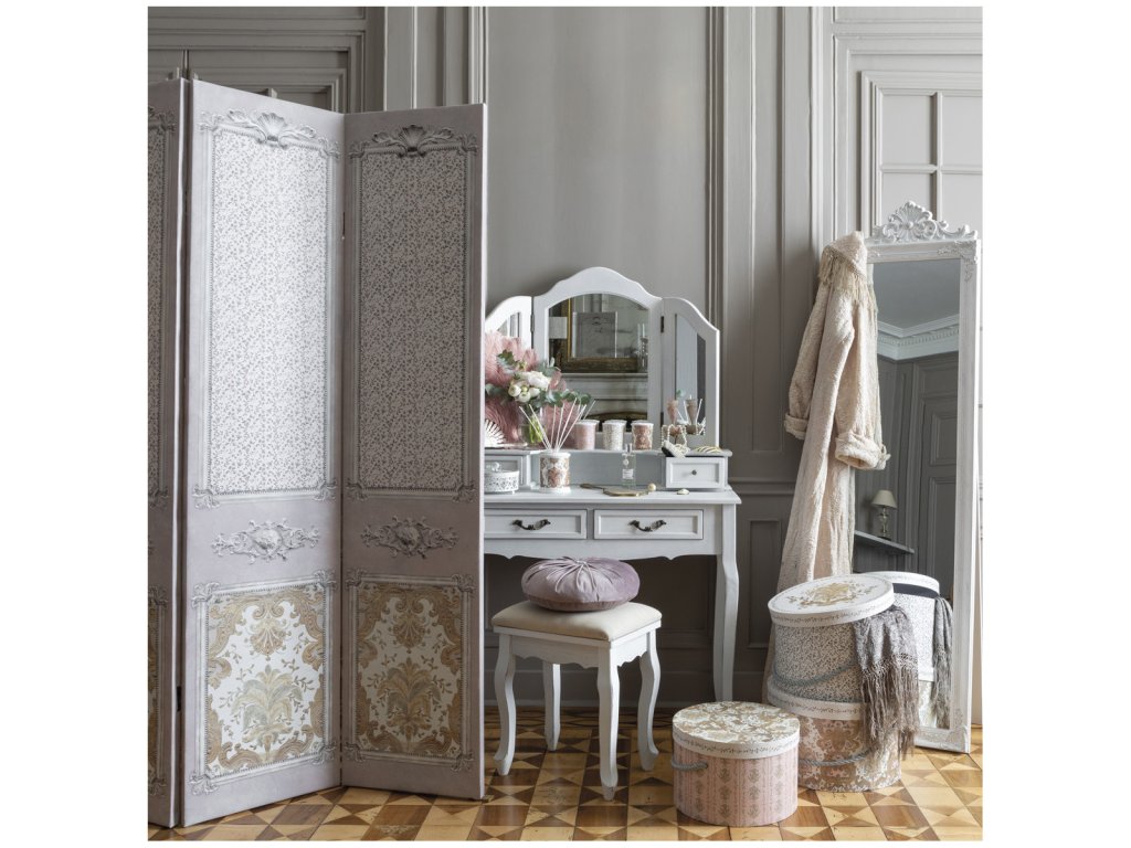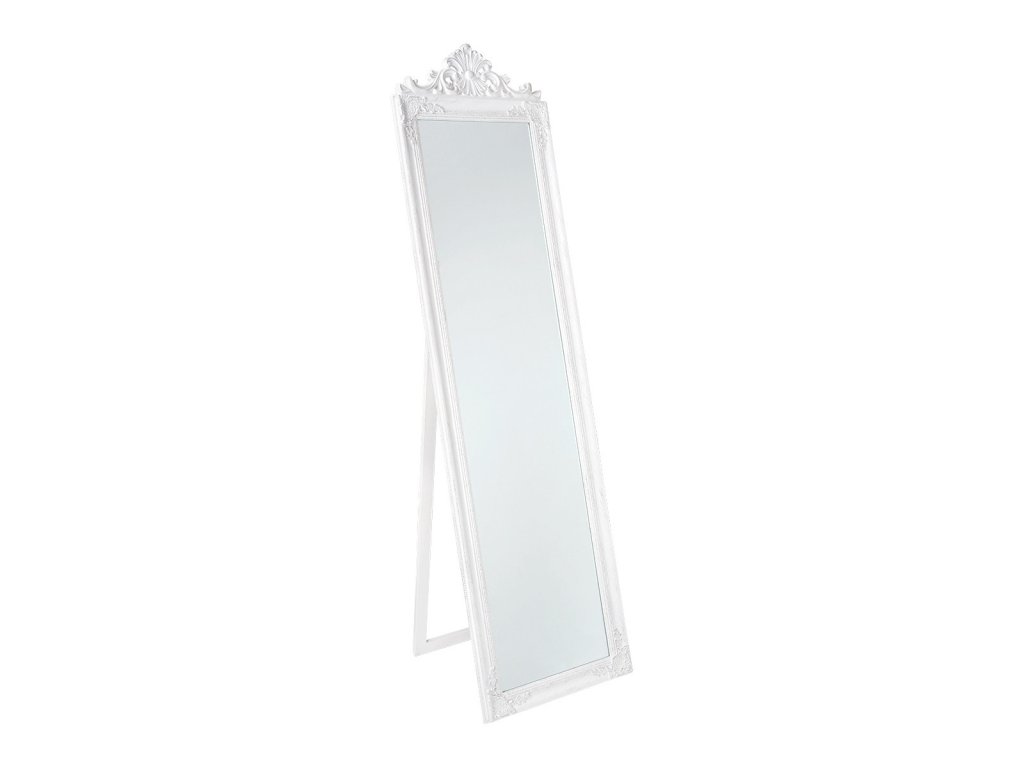 Biele stojaté zrkadlo s jemnými ornamentami.